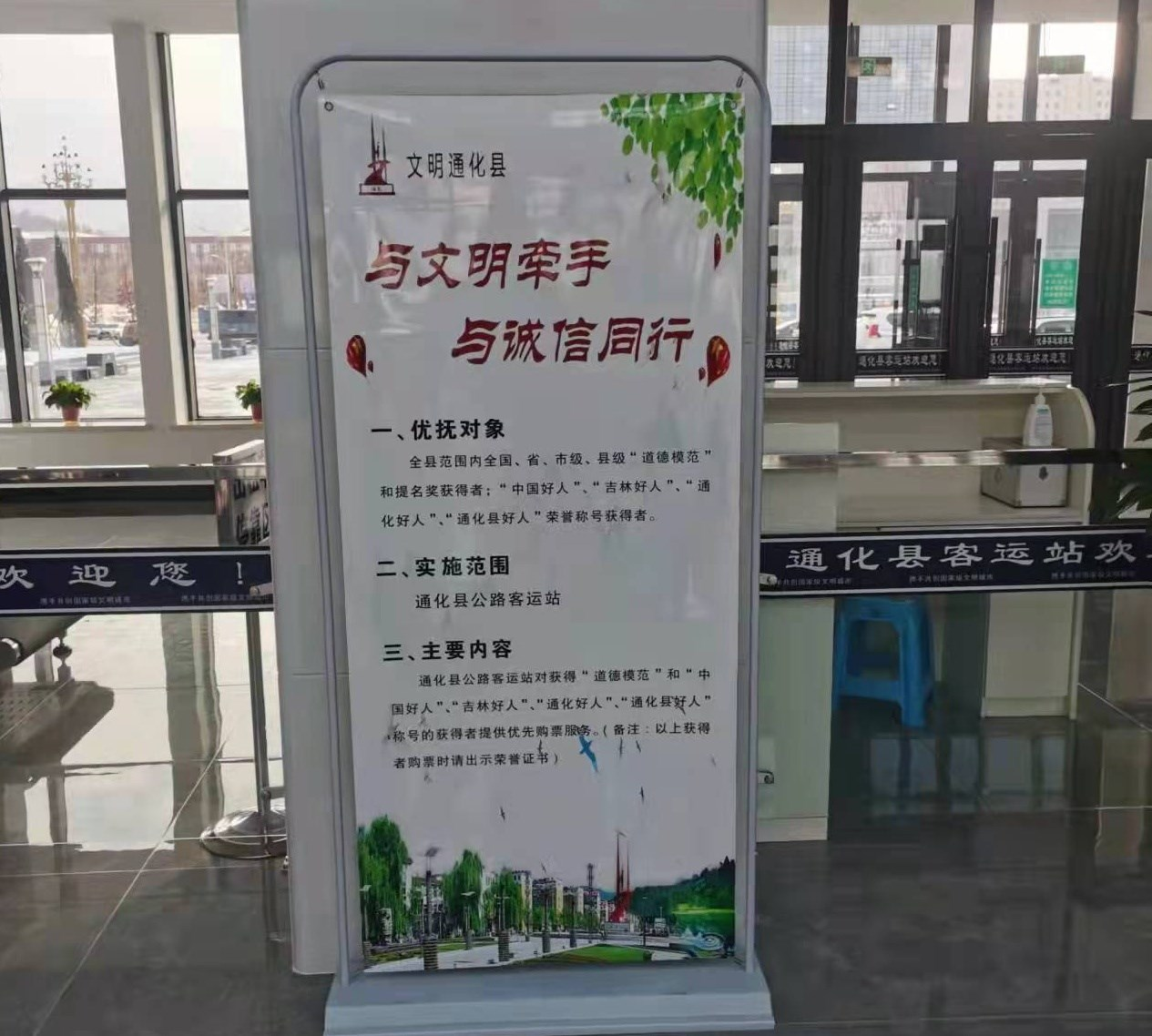 通化县交通局为加大对守信主体激励力度,在通化县公路客运站购票窗口增加“道德模范”和“中国好人”、“吉林好人”、“通化好人”、“通化县好人”优先展示标识,同时为礼遇对象本人提供优先购票服务。让更多的守信者得到信用红利,营造信用有价的浓厚氛围。